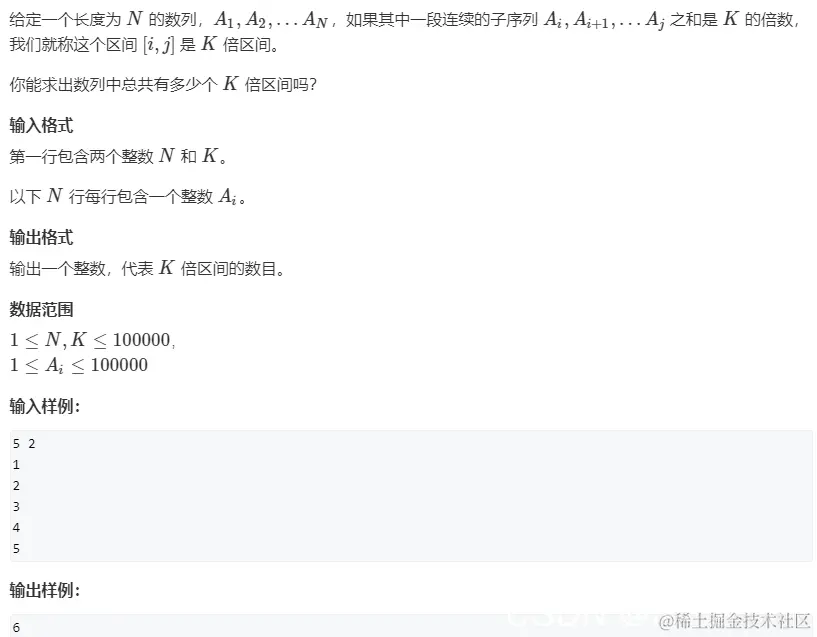 //答案等于前缀中出现过的和s[i]余k相等的计数之和,完成答案的计算之后需要将计数数组更新,加上自己