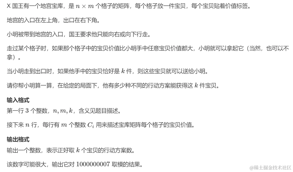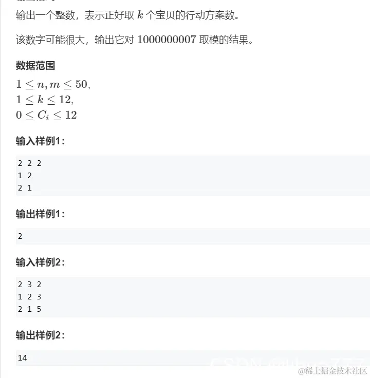 for (int i = 1; i <= 13; i++)res = (res + dp[n][m][k][i]) % MOD;//总方案数量等于当前数量下所有价值的数量总和