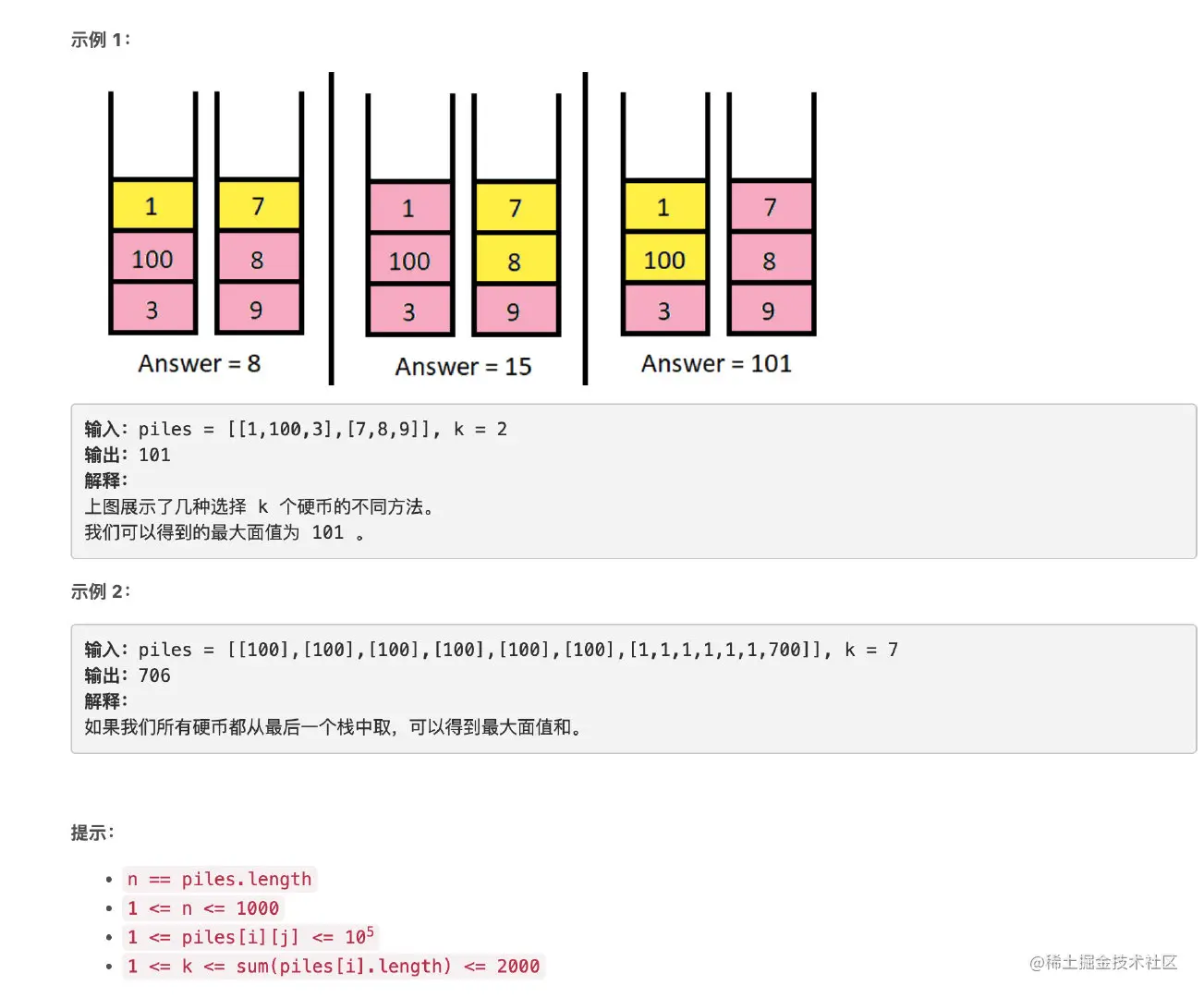 其次分析题意,我们要从n堆硬币当中拿若干枚。由于每一枚硬币的价值都大于0,并且k小于硬币的总数,所以k一定是要拿满的。其次硬币是罗列的,这意味着我们在同一列硬币当中拿取若干次,可以合并成拿取一次。