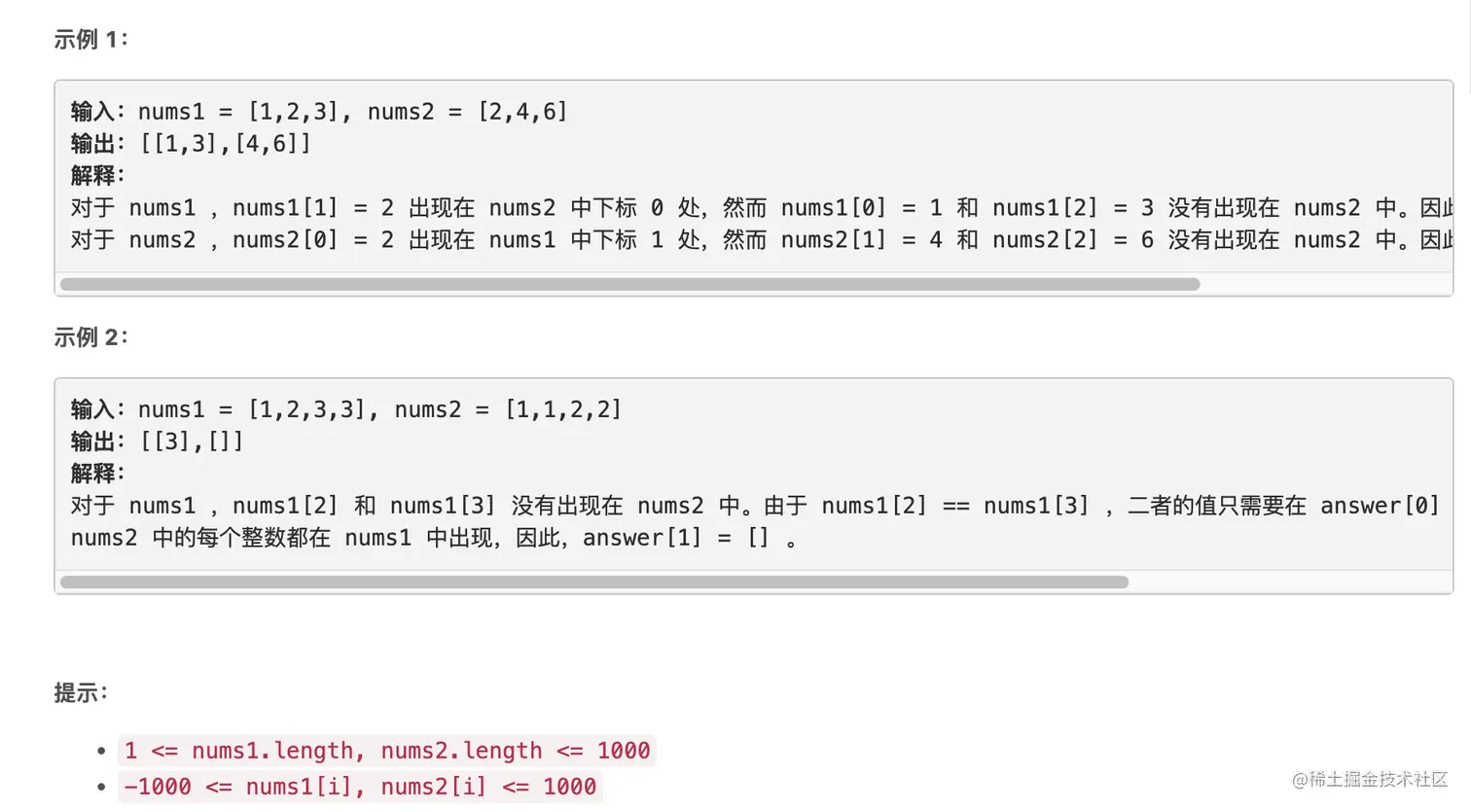 answer[0]是nums1中所有 不 存在于nums2中的 不同 整数组成的列表。answer[1]是nums2中所有 不 存在于nums1中的 不同 整数组成的列表。