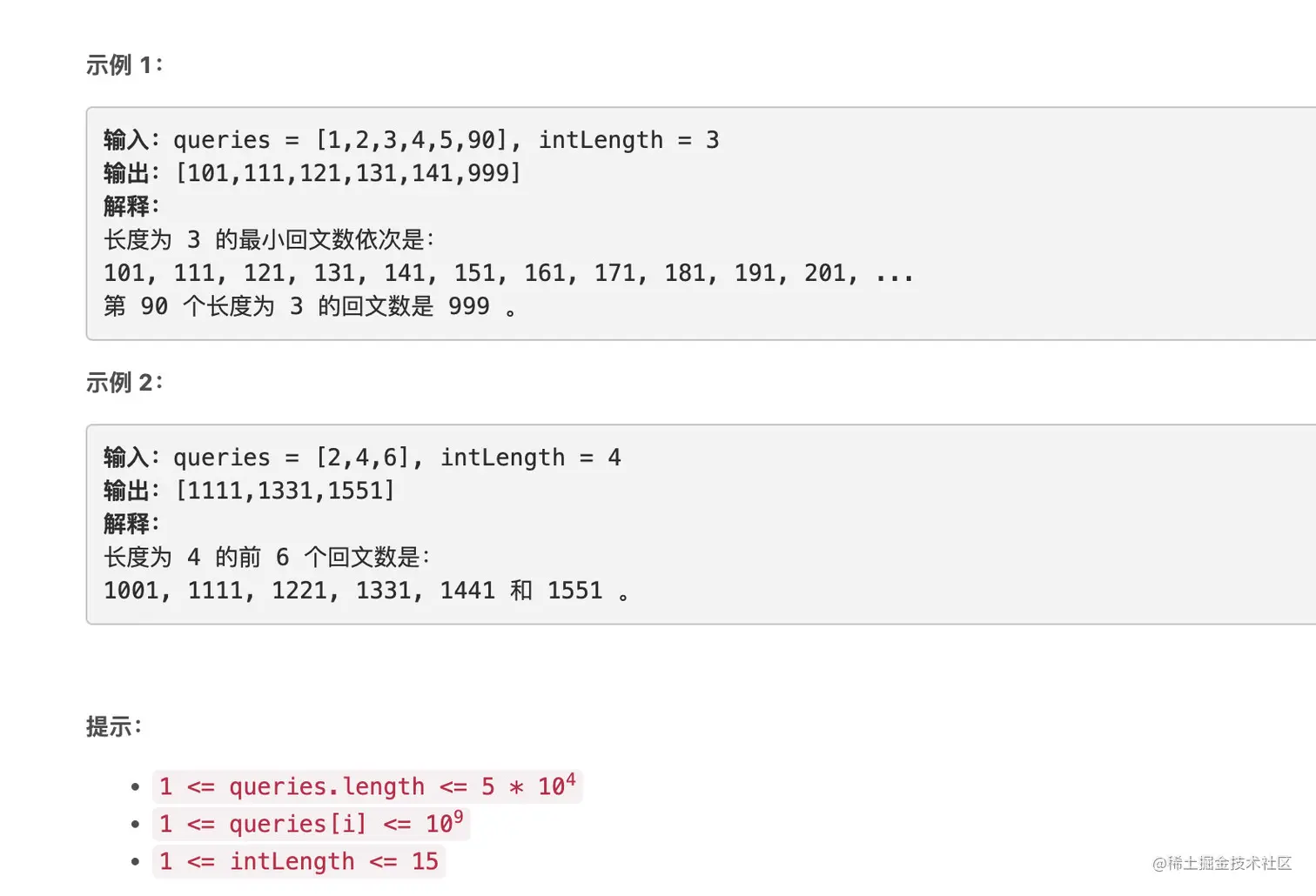 还是老规矩,先来看数据范围。发现里面query的最大范围是1e9,也就是说最多可能要范围序号1e9的回文数。这么大的范围看着是很吓人,但也侧面说明了,按顺序一个一个生成是不可能的。大概率有的方法可以直接计算。