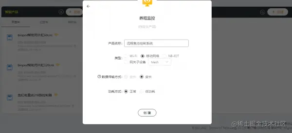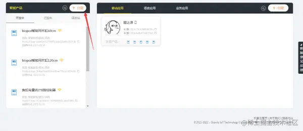 1.进入机智云新版本开发者中心,点击左上角创建,创建一个新的移动网络产品。