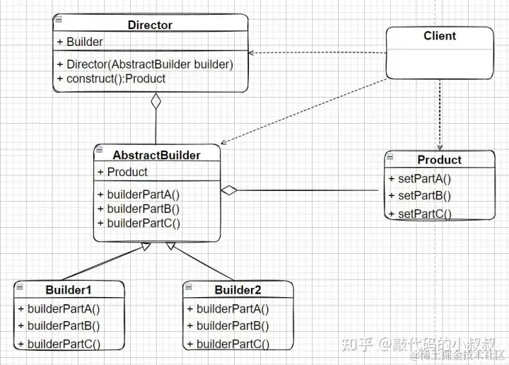 Product:包含多个组件的产品,需要由具体建造者进行创建AbstractBuilder:创建具体建造者的接口,通常还包括一个返回产品的接口Concrete Builder:继承/实现抽象建造者,完成产品的各个部分的具体创建方法Director:负责调用建造者以及内部具体产品对象的构建,在这之中不涉及具体的产品信息