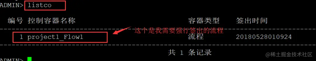 3.在ctladmin程序中执行listco命令,并确认您需要强行签出的流程