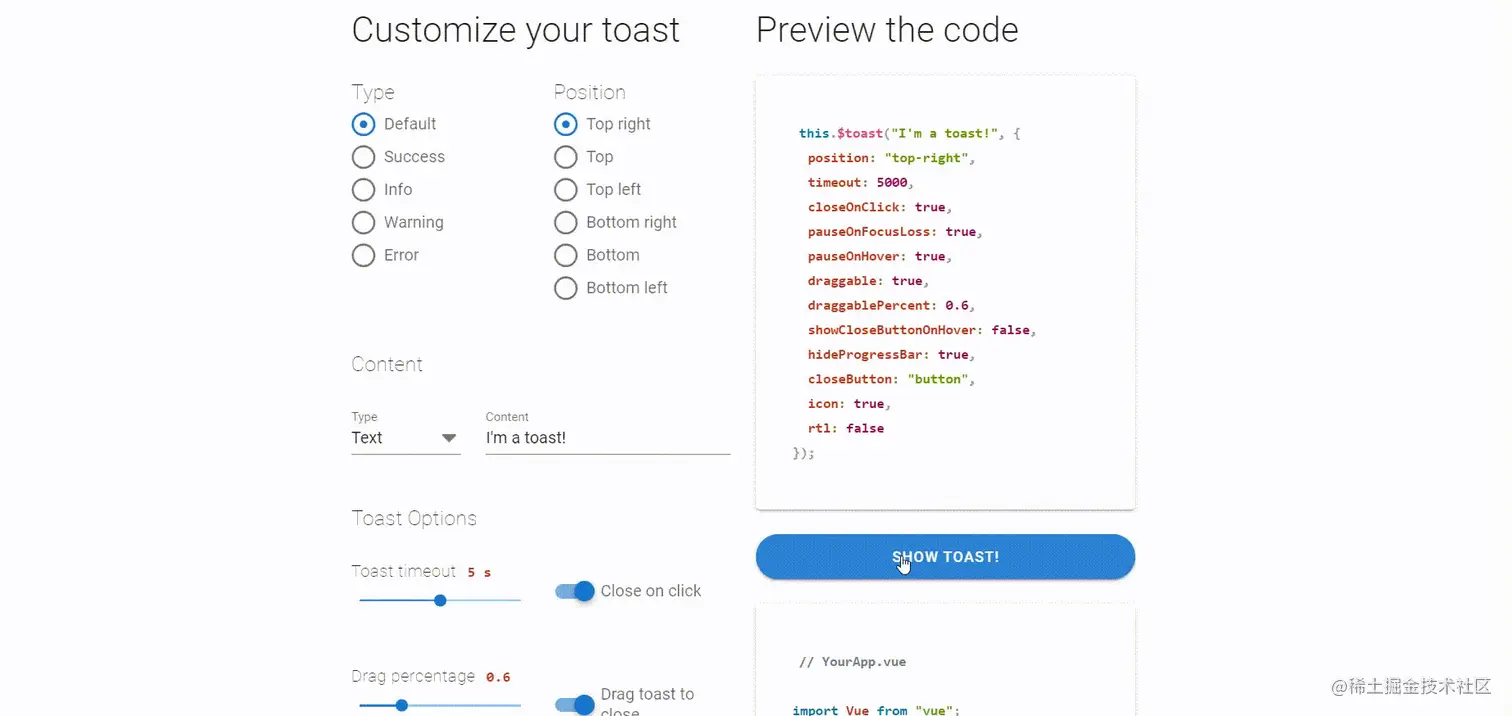 Vue Toastification 是一个轻量、易用且美观的提示条通知组件,提供了大量的选项来支持大部分自定义选择。