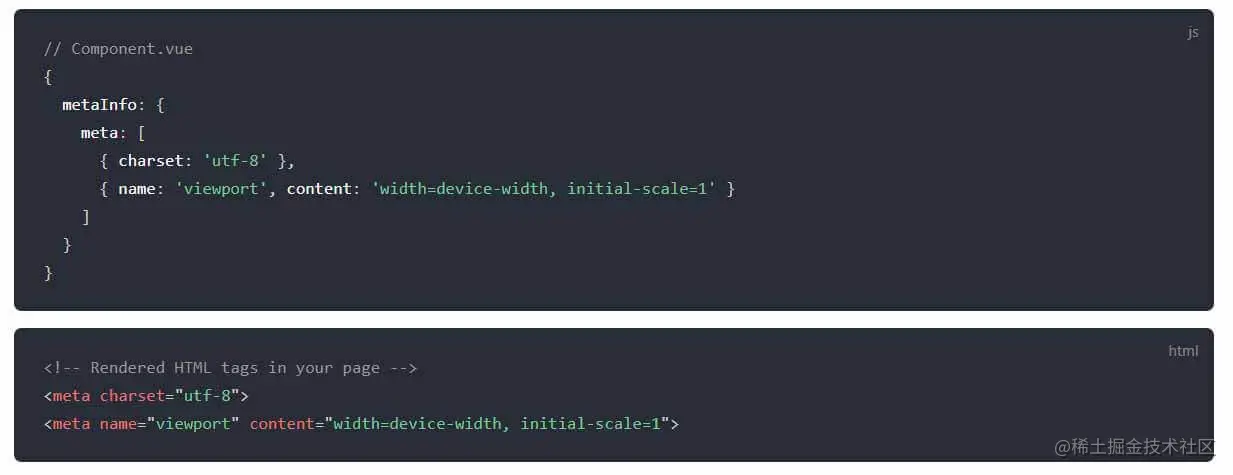 - 在组件内设置 metaInfo,便可轻松实现头部标签的管理。