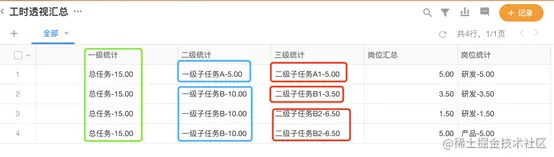完成这些配置和数据录入后,各个日报的数据里就会分别显示上面各级的汇总信息,并且实现一个增强版本的透视图效果。