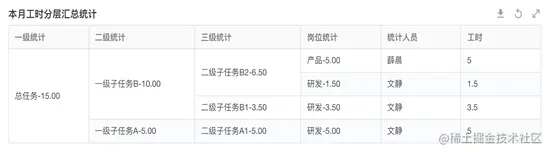 例如:在将工作任务逐级分解执行后,需要再根据员工的日报逐级进行工时汇总,一项工作任务可以关联到任何一级任务。下图这个任务工时统计,就将从总任务到二级子任务的各级任务都逐级进行数据汇总。