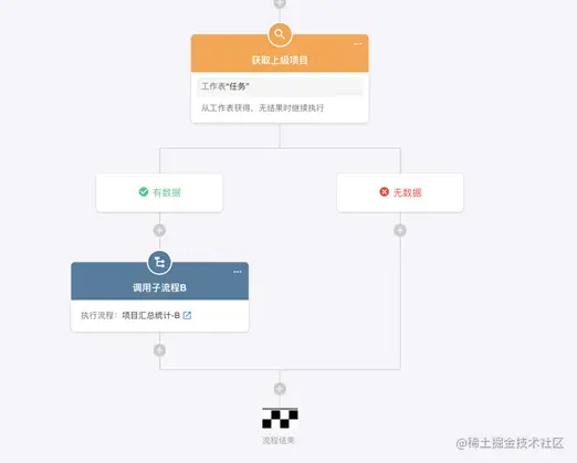 然后按照层级关系逐级累加,并且将各级汇总数据关联到当前记录。在逐层累加的设计中我们使用了A、B子流程循环调用的模式,子流程中封装了累加当前层级汇总数据和关联数据源表记录的逻辑。一个子流程处理完成后,只需要判断当前计算的层级是否还有上级,如有就调用另一个相同结构的子流程B继续进行累加,循环往复。