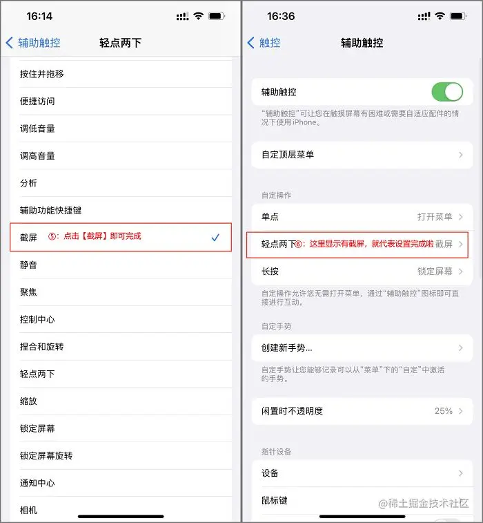 步骤3:找到【截屏】,然后就可以返回,看到【轻点两下】边上显示出了【截屏】就代表已经完成设置了。