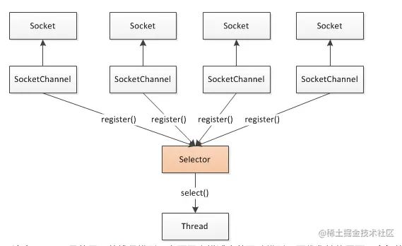 Selector:Selector(选择器)是Java NIO中能够检测一到多个NIO通道,通道将关心的事件注册到selector 上,selector能够知晓通道是否为这些事件诸如读写事件做好数据准备。这样,一个单独的线程可以管理多个channel,从而管理多个网络连接。
