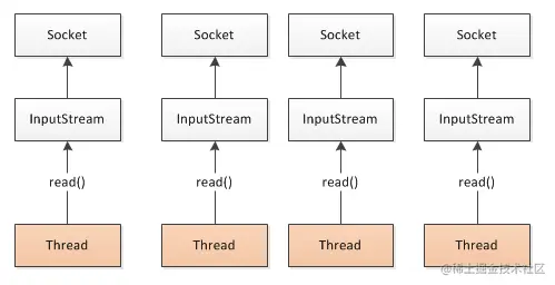同步阻塞IO模式,数据的读取写入必须阻塞在一个线程内等待其完成。这里使用那个经典的烧开水例子,这里假设一个烧开水的场景,有一排水壶在烧开水,BIO的工作模式就是, 叫一个线程停留在一个水壶那,直到这个水壶烧开,才去处理下一个水壶。但是实际上线程在等待水壶烧开的时间段什么都没有做。不知道io操作中什么时候有数据可读,所以一直是阻塞的模式。