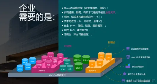 WorkPlus移动平台:私有化部署、移动业务,完善的APP应用平台,帮助您进行企业价值链间的生态连接,安全高效。