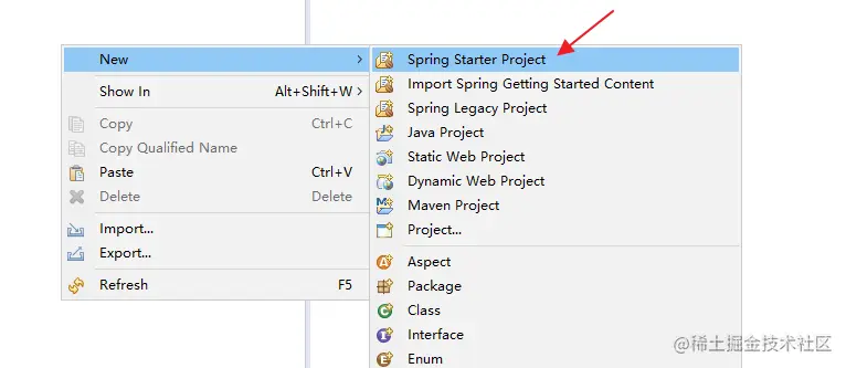 首先右键单击,选择 New -> Spring Starter Project ,如下图: