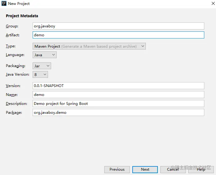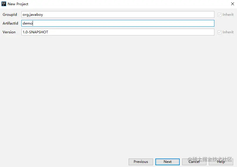 注意这里不用选择项目骨架(如果大伙是做练习的话,也可以去尝试选择一下,这里大概有十来个 Spring Boot 相关的项目骨架),直接点击 Next ,下一步中填入一个 Maven 项目的基本信息,如下图: