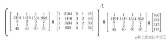 数据包括四个特征(不包括X0),我们加入X0=1,这时候我们使用正规方程方法来求解: