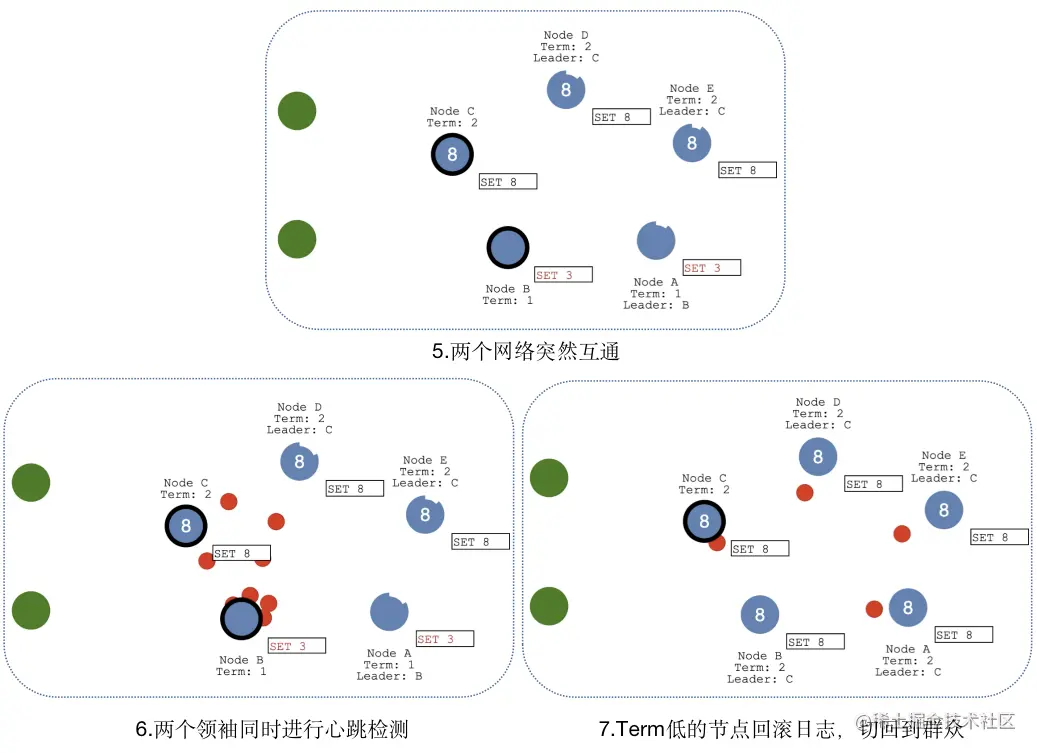 当网络问题导致脑裂,出现双Leader情况时,每个网络可以理解为一个独立的网络,因为原先的Leader独自在一个区,所以向他提交的数据不可能被复制到大多数节点上,所以数据永远都不会提交,这个可以在第4幅图中提现出来(SET 3没有提交)。
