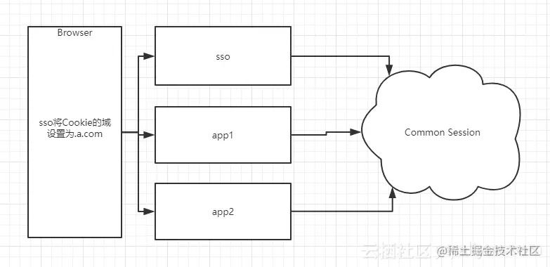 一个企业**一般情况下只有一个域名,通过二级域名区分不同的系统。**比如我们有个域名叫做:a.com,同时有两个业务系统分别为:app1.a.com和app2.a.com。我们要做单点登录(SSO),需要一个登录系统,叫做:sso.a.com。 我们只要在sso.a.com登录,app1.a.com和app2.a.com就也登录了。通过上面的登陆认证机制,我们可以知道,**在sso.a.com中登录了,其实是在sso.a.com的服务端的session中记录了登录状态,同时在浏览器端(Browser)的sso.a.com下写入了Cookie。**那么我们怎么才能让app1.a.com和app2.a.com登录呢?这里有两个问题: