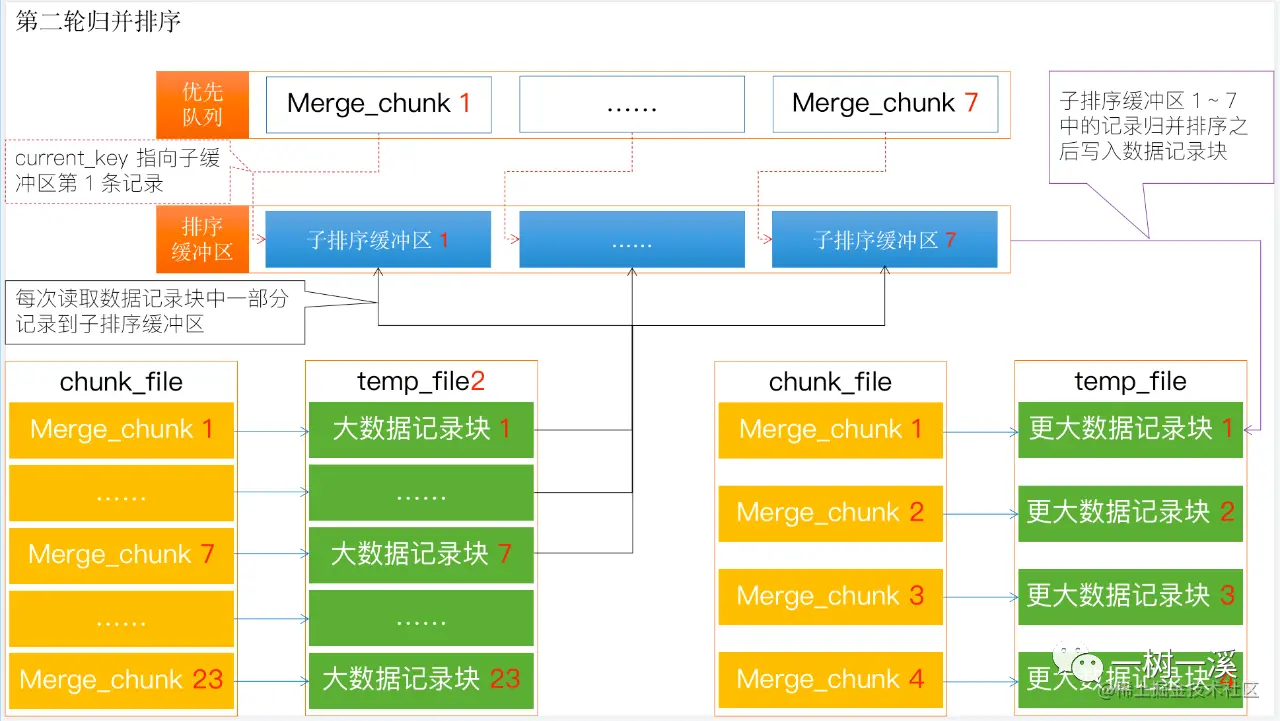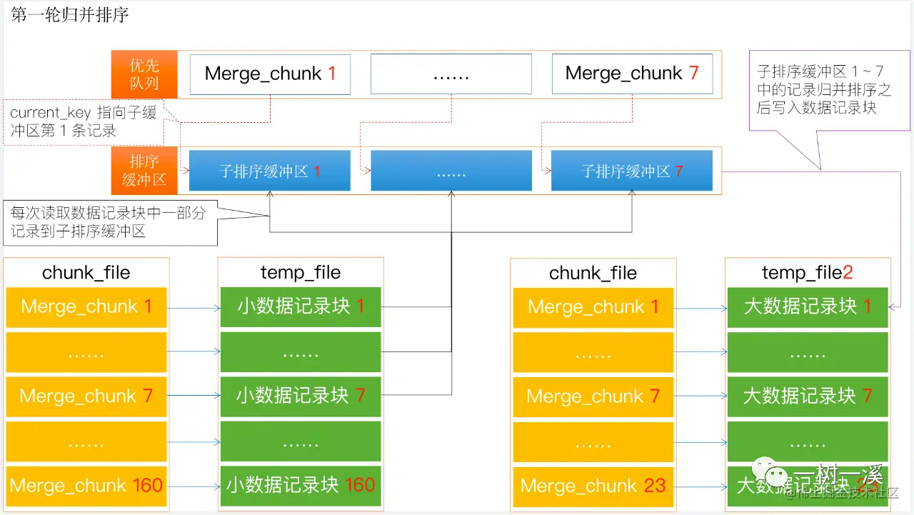 左下角 chunk_file 中有 160 个 Merge_chunk,temp_file 有 160 个对应于 Merge_chunk 的数据记录块。归并排序过程中会借助排序缓冲区提升执行效率,因为要进行 7 路归并排序,排序缓冲区被平均分为 7 份,每份对应于 temp_file 中的一个数据块,为了描述方便,我们暂且把排序缓冲区的七分之一叫做子排序缓冲区。在归并排序过程中,会分别从 temp_file 中的 7 个数据记录块中读取一部分记录到其对应的子排序缓冲区。