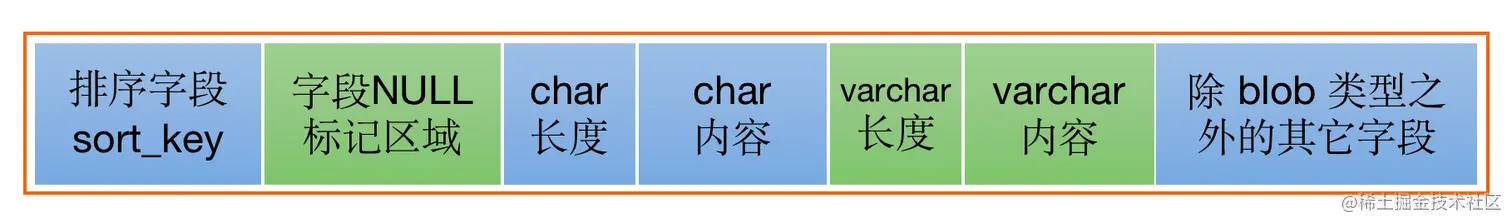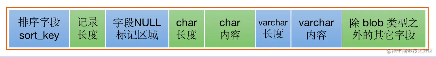 除 blob 类型之外的其它字段:指是的除 tinyblob、mediumblob、blob、longblob、tinytext、mediumtext、text、longtext、json、geometry 之外的其它类型字段,只需要把字段内容写入排序缓冲区,不需要写入字段长度。