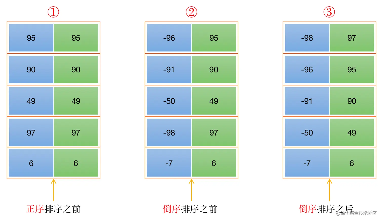 从 3 号图示可见,倒序排序时,对排序字段值取反之后按照正序排序,最终实现了记录的倒序排序。