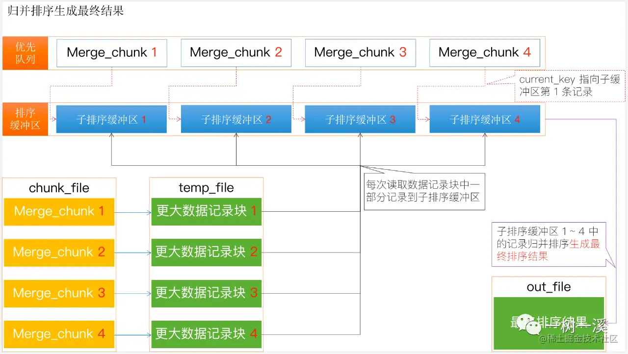 读取 temp_file 中数据记录块的数据到子排序缓冲区之后,优先队列中的每个 Merge_chunk(对应于 chunk_file 中的 Merge_chunk)中有一个属性 current_key,指向子排序缓冲区中的第一条记录,图中优先队列的每个 Merge_chunk 有个红色箭头指向子排序缓冲区,就是表示 current_key 属性指向子排序缓冲区中的第一条记录。
