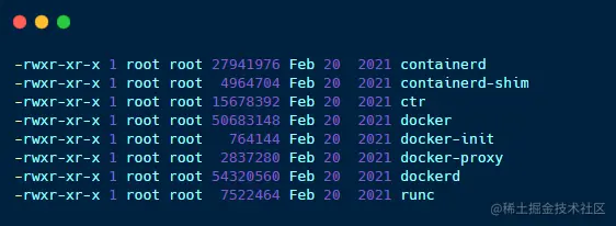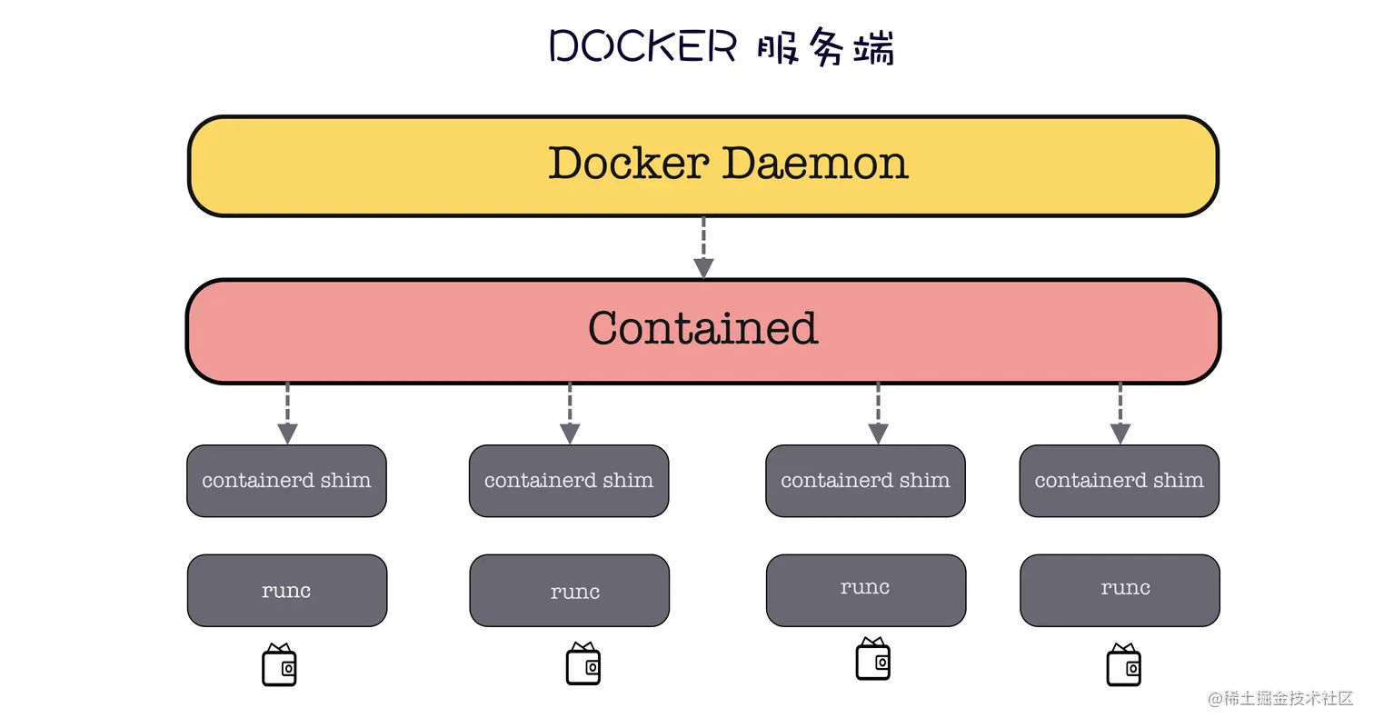 - contained:是容器标准化后的产物,从 Dockerd 剥离出来,contained 通过 contained-shim 启动并管理runc,可以说 contained 是真正管理容器的生命周期