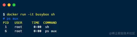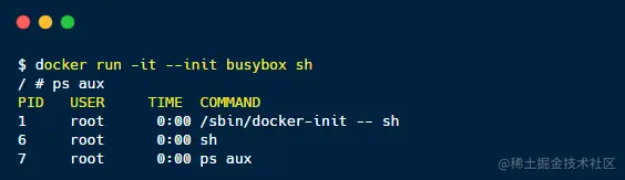 你会发现,此时的 1 号进程为 docker-init,而不是 sh 了