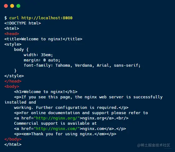 假设目前启动一个 nginx 容器并将容器的 80 端口映射到主机的 8080 端口