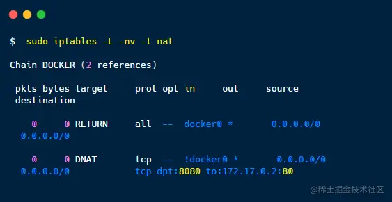 从最后一句可以看出,当我们主机访问 8080 端口的时候,iptable 将流量会转发给 172.17.0.2 的 80 ,从而实现主机上直接访问容器的业务