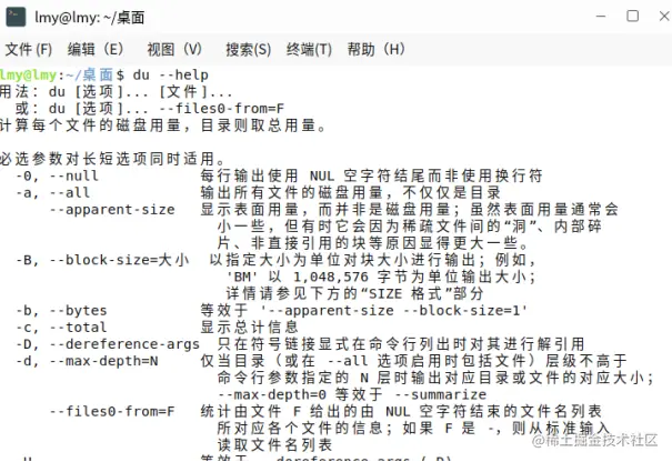 当我们忘记某个命令如何使用时,我们可以使用命令行 ”help“ 来显示该命令的用法。几乎所有的命令和命令行工具都带有一个帮助页面,使用方法也很简单,直接输入****【命令】** --help** 即可,例如查看 du 命令有哪些用法和常见参数: