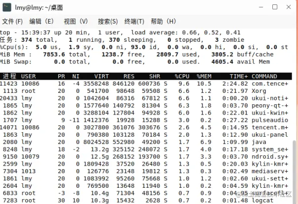 默认情况下,top 输出结果是按 CPU 占用进行排序,每 5s 更新一次结果。当发现某个进程占用系统资源过多却并不需要它时,将其杀死即可!