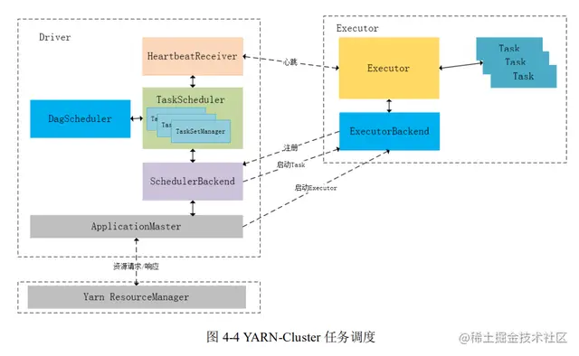 SchedulerBackend 向 ApplicationMaster 申请资源,并不间断地从 TaskScheduler 获取 task 并发送给 合适的 Executor;