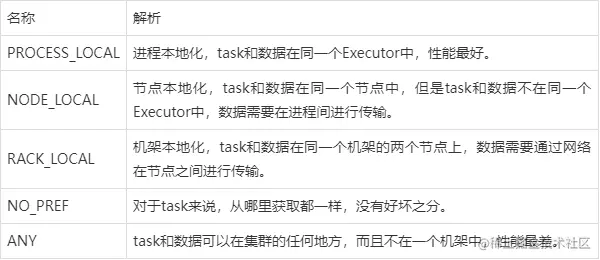 根据每个Task的优先位置,确定Task的Locality级别,Locality一共有五种,优先级由高到低顺序: