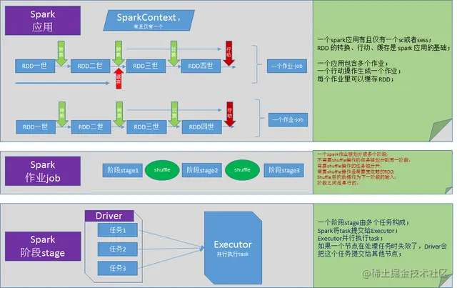 当Driver起来后,Driver则会根据用户程序逻辑准备任务,并根据Executor资源情况逐步分发任务。在详细阐述任务调度前,首先说明下Spark里的几个概念。一个Spark应用程序包括Job、Stage以及Task三个概念: