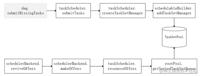 上图中,将TaskSetManager加入rootPool调度池中之后,调用SchedulerBackend的riviveOffers方法给driverEndpoint发送ReviveOffer消息;driverEndpoint收到ReviveOffer消息后调用makeOffers方法,过滤出活跃状态的Executor(这些Executor都是任务启动时反向注册到Driver的Executor),然后将Executor封装成WorkerOffer对象;准备好计算资源(WorkerOffer)后,taskScheduler基于这些资源调用resourceOffer在Executor上分配task。