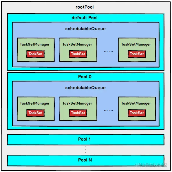 FAIR模式中有一个rootPool和多个子Pool,各个子Pool中存储着所有待分配的TaskSetMagager。