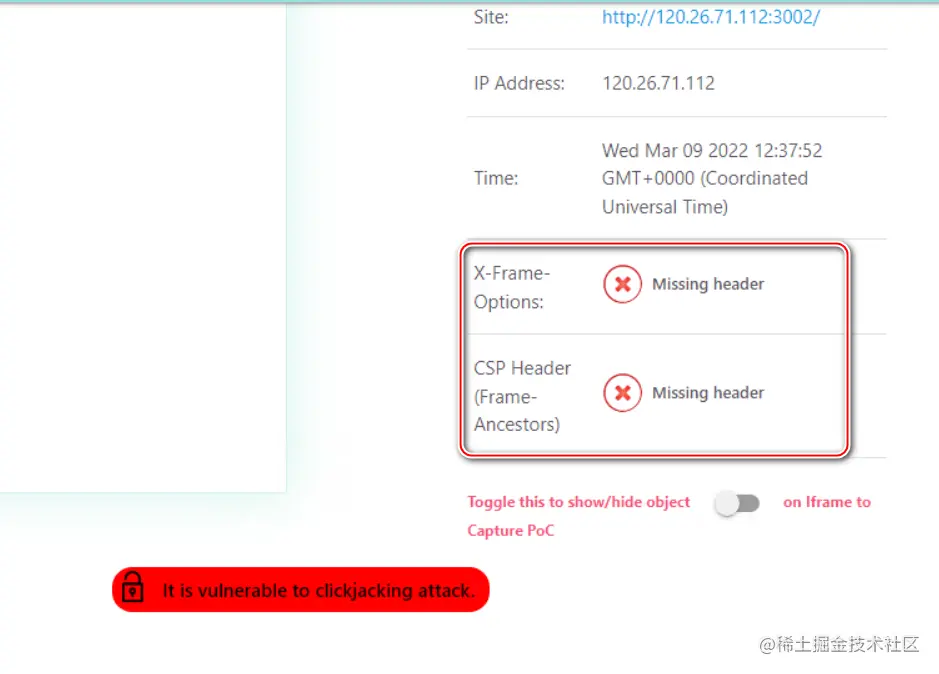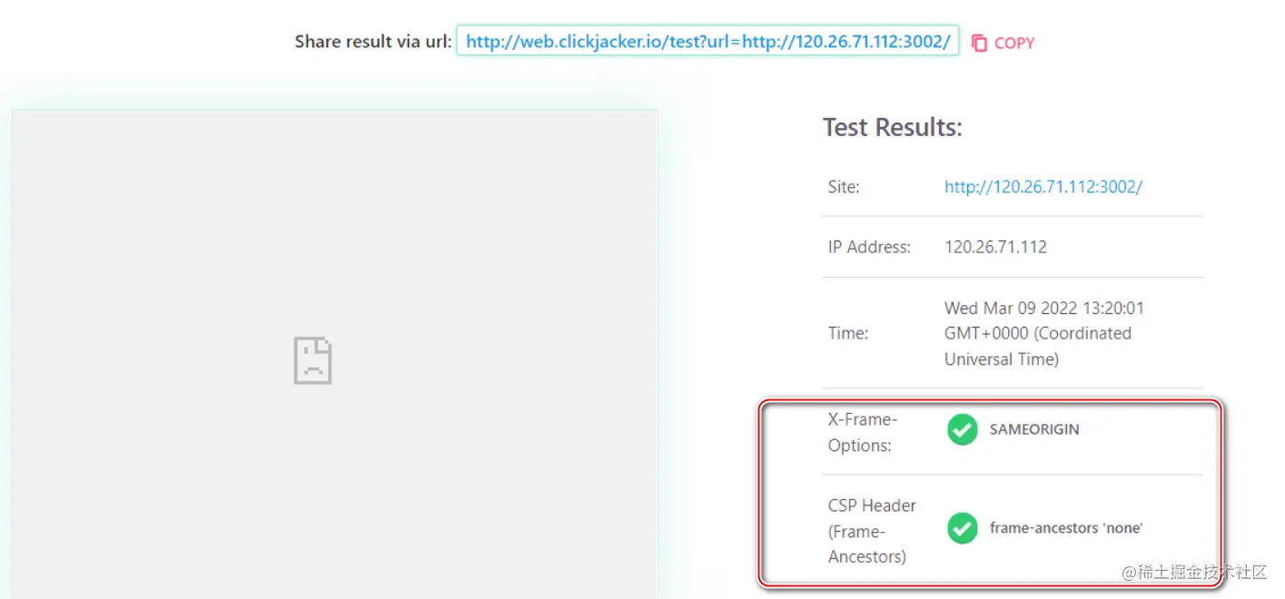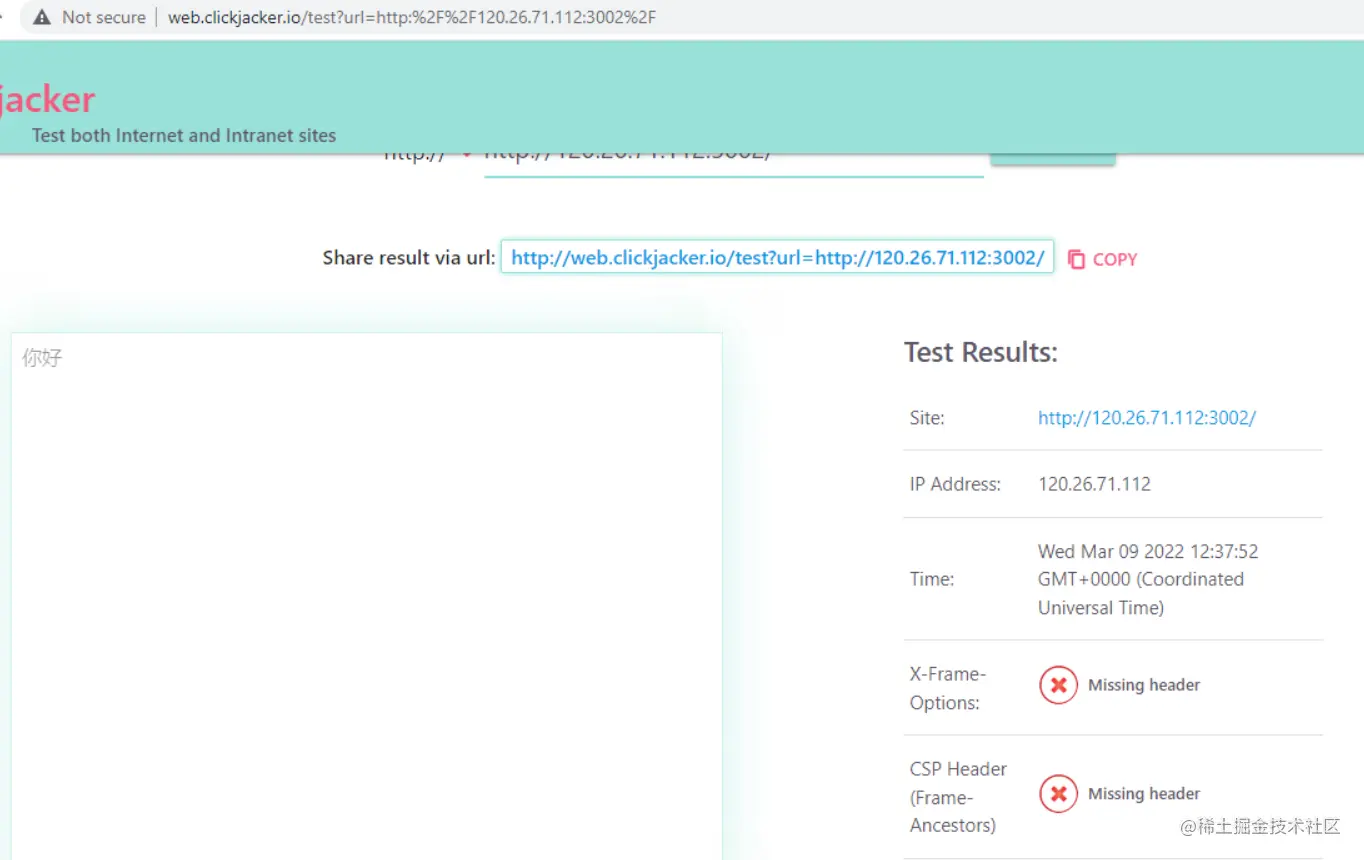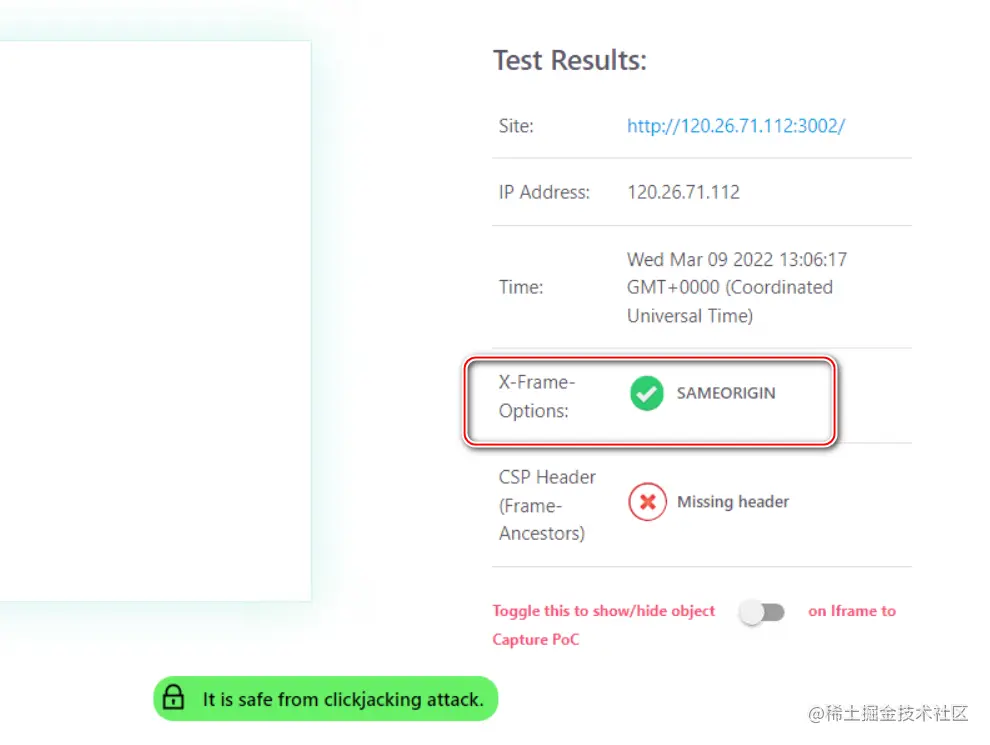 我们可以使用下面这个工具网站来检测自己的网站是否存在被 clickjacking 攻击的漏洞。