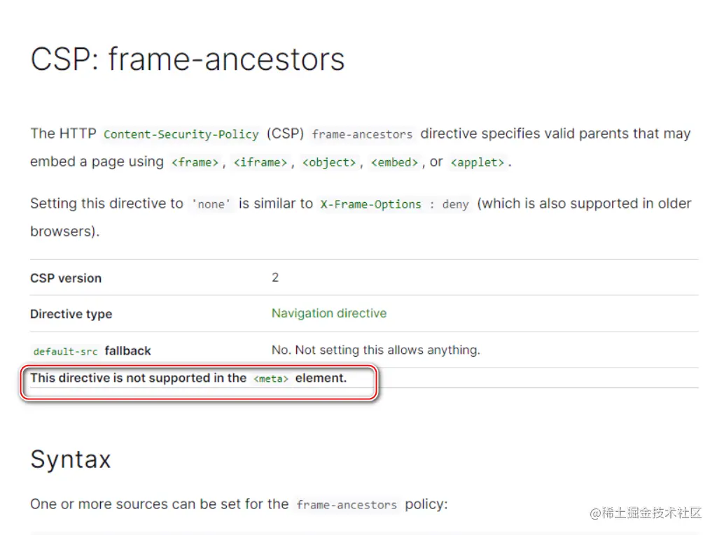 另一个指令:CSP: frame-ancestors,同样不支持在 meta 元素里定义: