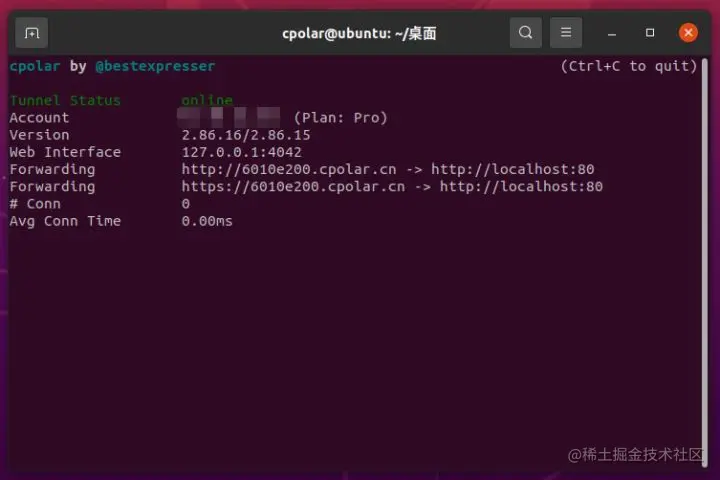 想要让cpolar客户端生成数据隧道十分简单,只要打开Ubuntu的命令行界面,输入简单的命令“cpolar http 80”即可。此处的80为端口号,也可以是8080等,具体看本地软件使用按个端口输出网页。