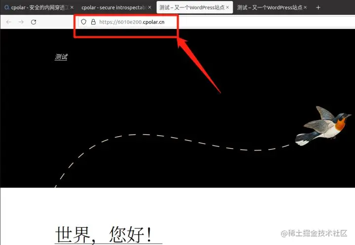 在浏览器输入cpolar生成的地址后(无论是本地cpolar客户端显示的地址,还是cpolar官网“状态”栏显示的地址),均能正确的显示位于我们本地电脑上的wordpress网页,也就证明我们已经成功的将本地网页发布到公共互联网上,并能够为公网访客所访问到。