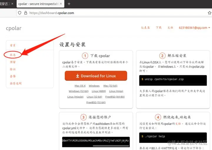 同样还是登录cpolar官网,在登录后点击仪表盘左侧的“状态”按钮