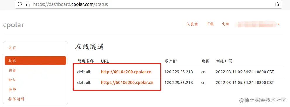 在“状态”页面,我们就能看到cpolar生成的隧道信息,与本地cpolar隧道信息一致。