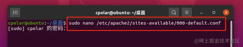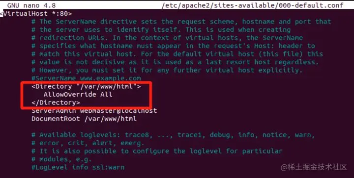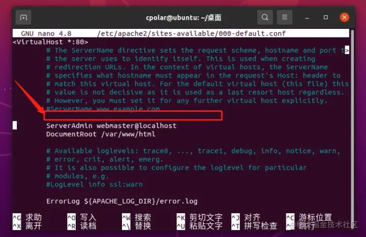 在apache2重启后,我们接着对apache2的配置文件进行一个简单的编辑。即输入命令“sudo nano /etc/apache2/sites-available/000-default.conf”