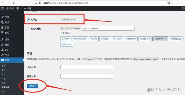 在这个页面,我们就能看到,可以将网站的固定链接更改为文章名,并在页面下方点击“保存更改”。
