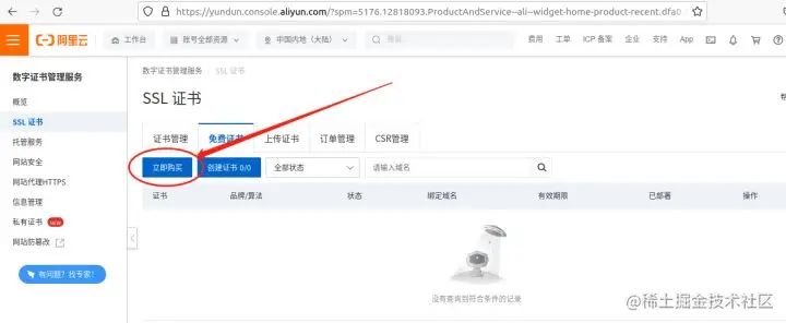 进入“免费证书”选项卡后,再点击“立即购买”按钮