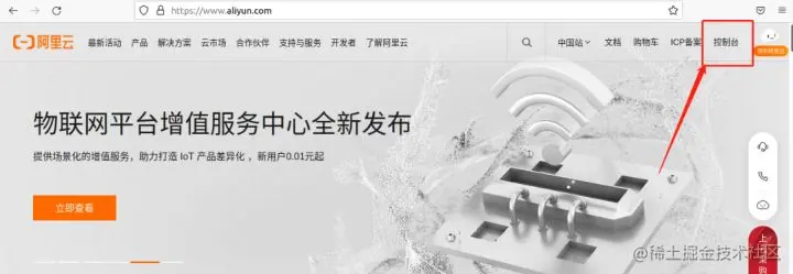 首先,需要回到我们购买域名的官网(这个案例中我们回到阿里云官网),登录后在页面右上方点击“控制台”按钮。