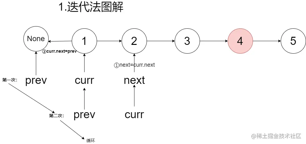 - 假如单链表为[1,2,3,4,5],curr指向第一个节点1,核心代码如下: