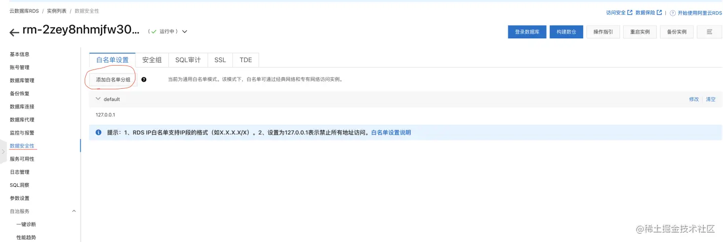 - 添加虚拟交换机网段(vswitch IP段)进入RDS白名单,详情参考:设置白名单文档